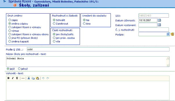 V případě oprávněného pokusu (střední škola) se zobrazí formulář pro změnové řízení: